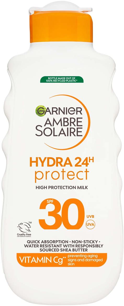 Our Garnier Ambre Solaire Hydra 24 Hour Protect Sun Protection Spray SPF30 provides advanced UVB and UVA protection against sun induced skin damage Provides high SPF 50 sun protection enriched with shea butter to hydrate skin for 24 hours and a water resistant formula that absorbs quickly without  Provides high SPF 50 sun protection enriched with shea butter to hydrate skin for 24 hours and a water resistant formula that absorbs quickly without  Garnier Ambre Solaire Hydra 24 Hour Sun Protection Spray SPF 30 provides high protection against sun induced skin damage and sunburn Garnier Ambre Solaire Hydra 24 Hour Sun Protection Spray SPF 30 provides high protection against sun induced skin damage and sunburn
